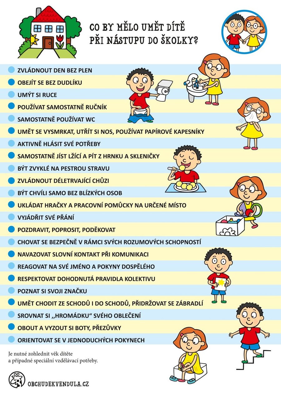 V případě, že Vaše dítě má zdravotní omezení /diety, alergie apod./ nebo vyžaduje speciální vzdělávací potřeby, uveďte tyto skutečnosti do přihlášky a dodejte potřebná potvrzení.